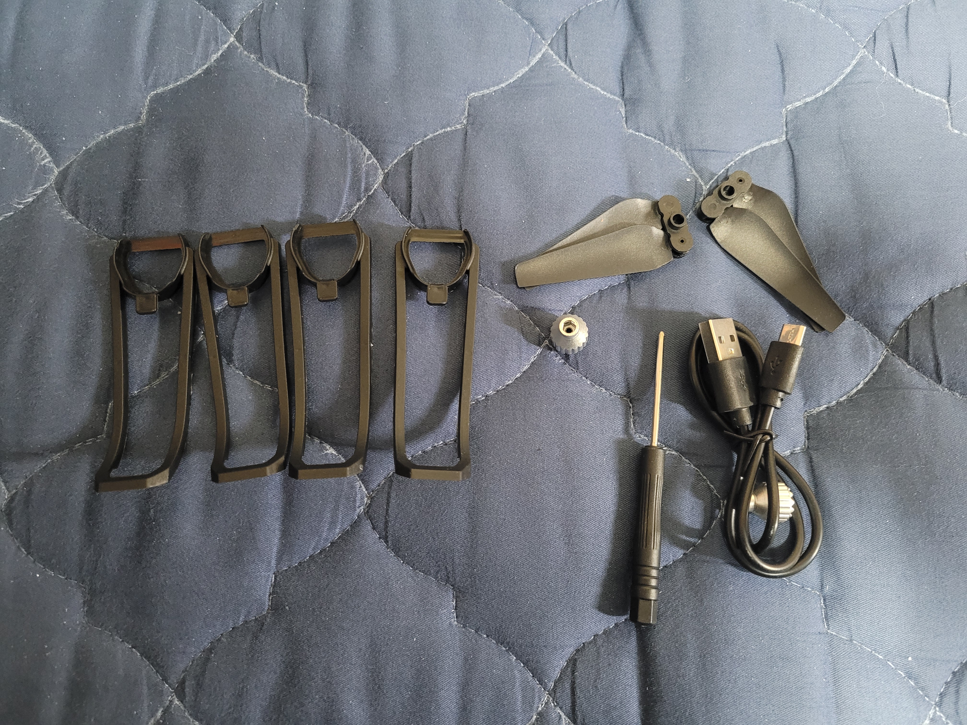부품 내용은 충돌방지 가이드 4개, 예비용 날기 2개, 조종기 스틱 2개, 충전 케이블이 들어 있습니다.