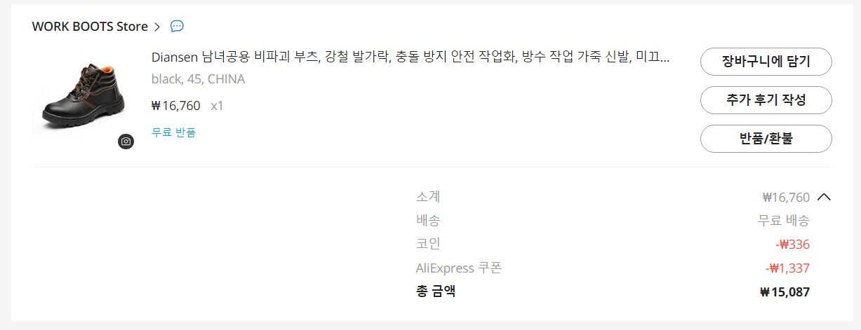 가격은 16,760원이고 쿠폰과 코인으로 할인 받아서 15,087원에 구입했네요.