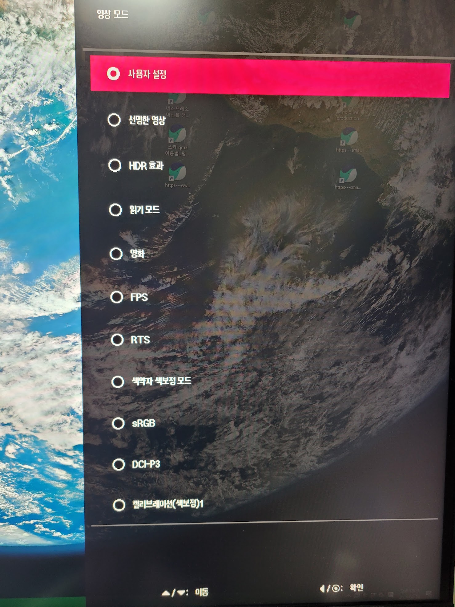 영상 관련의 선명한 영상 / HDR / 영화 모드, 게임 관련 FPS / RTS 모드