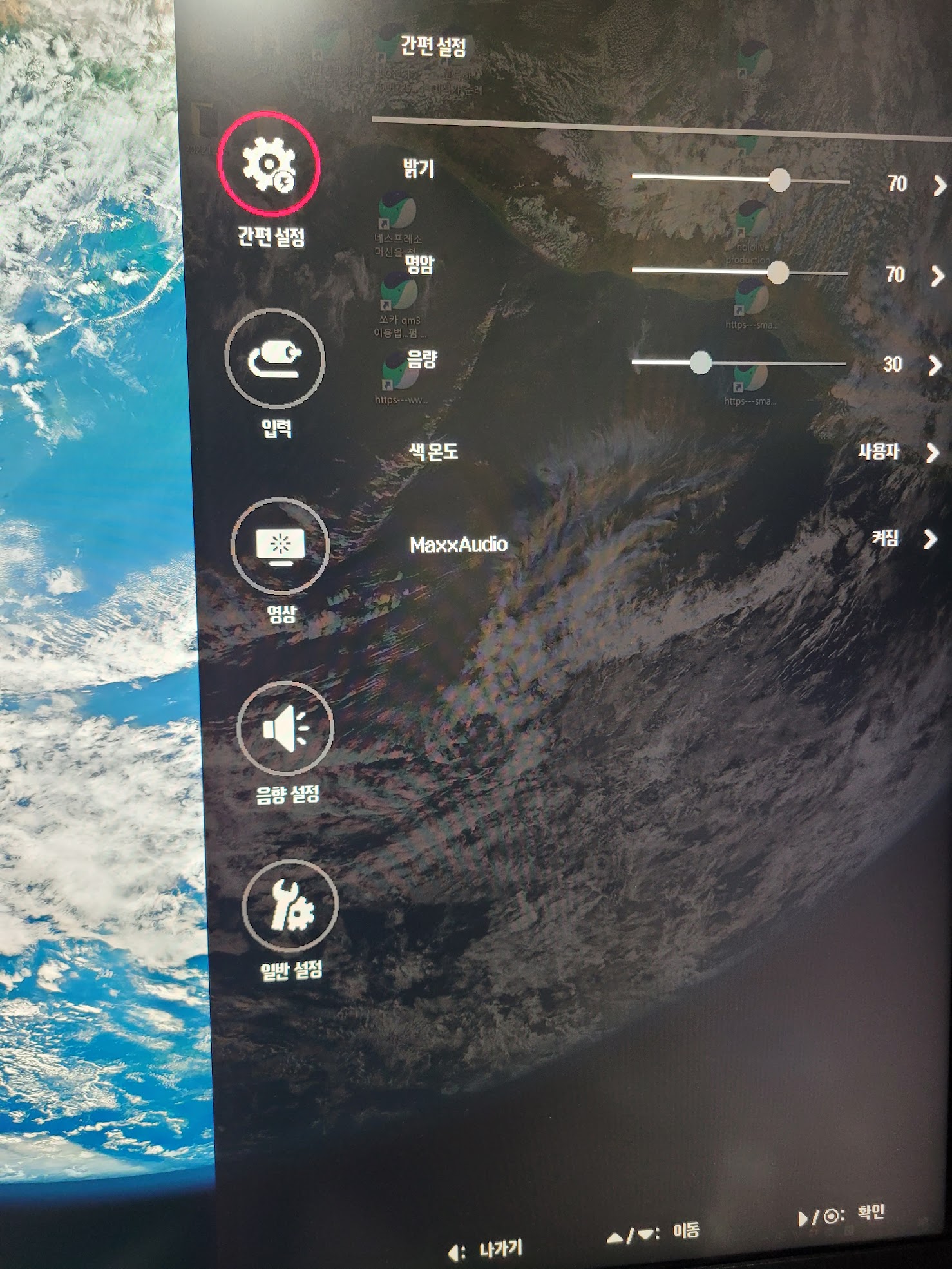 OSD 의 경우 하단의 조이스틱 스타일의 버튼을 누르고 선택 할 수 있습니다.